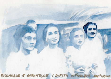 Nota: L’immagine utilizzata qui è tratta dai bozzetti preparatori per le opere pittoriche del progetto artistico “LIBERI! 80 anni dalla Liberazione” ispirato alle immagini di archivio della Lotta di Liberazione e ai primi 12 articoli della Costituzione italiana, ideato e realizzato da ANTONELLA CINELLI per l’Anpi provinciale di Bologna.